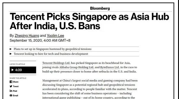 9月15日,繼阿里巴巴和字節跳動之后,騰訊集團也選擇在新加坡設立其在亞洲其他地區的橋頭堡。