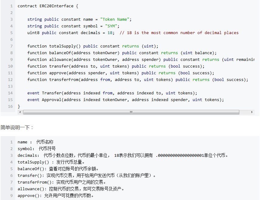這里也介紹一下ERC20,這是以太坊定義的令牌標準。這個標準要求我們在實現代幣時必須遵守約定。只有支持協議,才能得到以太坊錢包的支持。下面是協議代碼界面。看不懂也沒關系。程序員就能搞定。